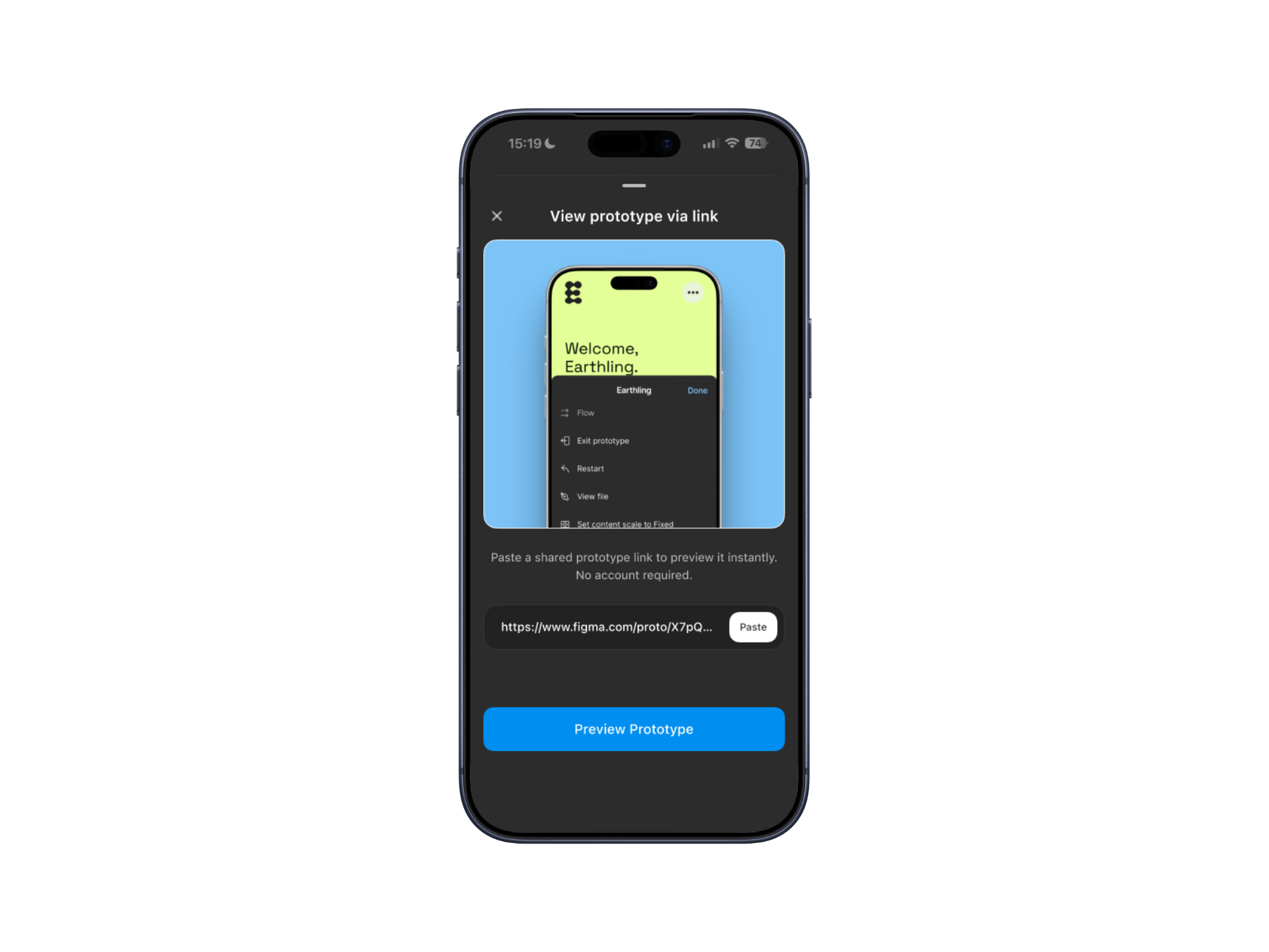 The recipient pastes the link, taps Preview prototype, and the prototype opens instantly.